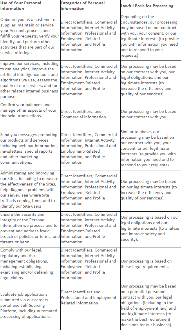 We collect your Personal Information detailed in “How We Collect and Use Your Personal Information” pursuant to the following lawful bases: