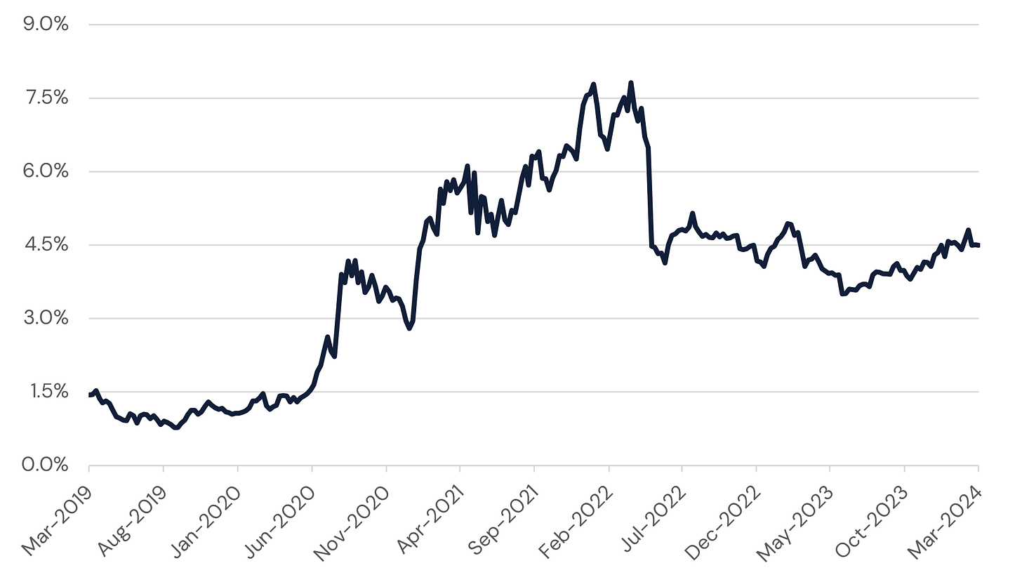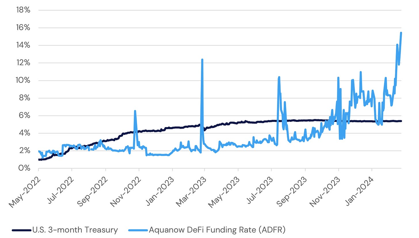 Naturally, as demand for credit rises, so too does the cost of borrowing, absent an influx of capital. Stablecoin issuance has grown about 15% off the lows, signaling some return of funds which fled the market after the collapse of 2022, but the yields earned by lending stablecoins to the institutional-sized pools on the battle tested DeFi protocols (as captured by Aquanow’s DeFi Funding Rate Index) remain particularly attractive.