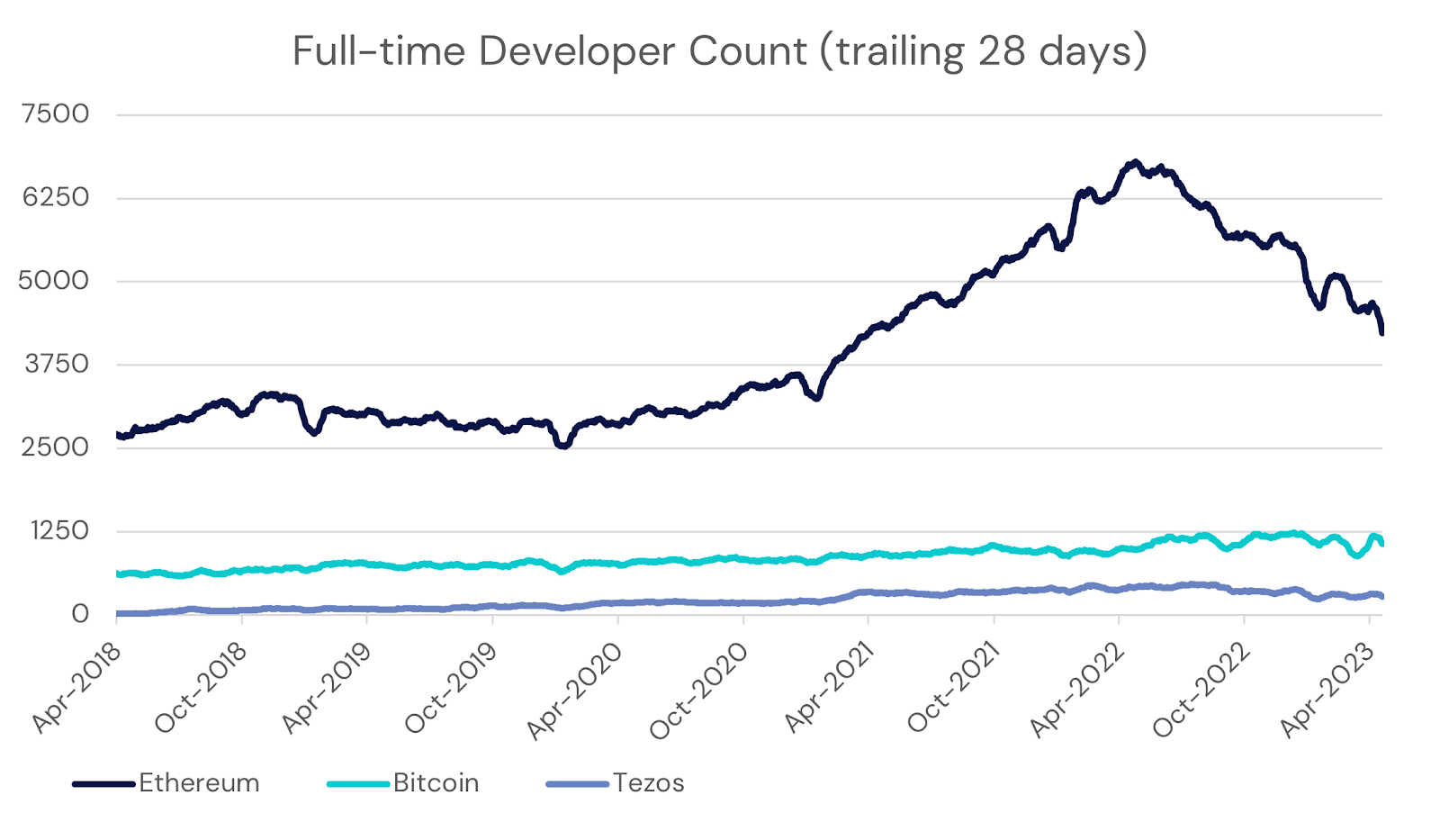 It’s important to note that the chart above has two vertical axes, which I chose expressly to highlight the recent spike in novel Bitcoin development. Ethereum continues to win over the greatest number of new engineers, but recent innovations in the Bitcoin ecosystem have drawn significant attention. Meanwhile, the bear market is evident on Ethereum and Tezos where new developer adds are materially below the 2022 peaks.