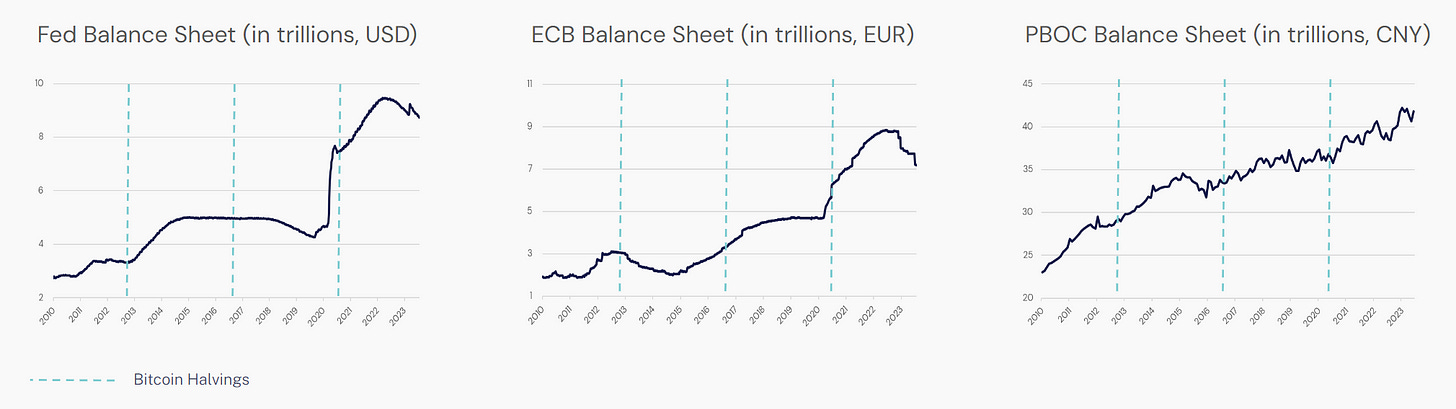 Dan Morehead acknowledges that each passing halving event will have less of an effect on price, which makes sense since the supply impact tapers. I think there’s more at play. Bitcoin is emerging as a non-sovereign global asset like gold and as such its price is increasingly related to the ebbs and flows of the world’s capital markets. Interestingly, halving events have tended to coincide with significant episodes of monetary stimulus from central banks around the world.