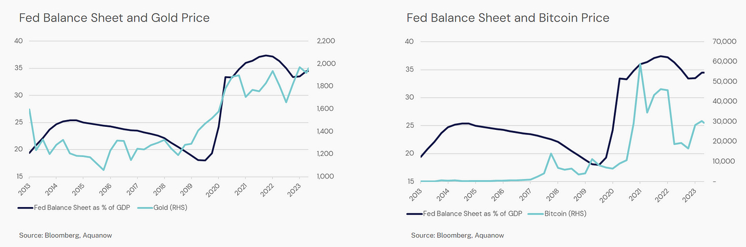 This kind of behaviour from currency issuers has the effect of increasing interest in assets which provide insulation against FX debasement, like real estate, infrastructure, and gold. While Bitcoin doesn’t have anywhere near the historical relevance of the yellow metal, it was borne out of the Great Financial Crisis and maintains a similar profile of a scarce, non-sovereign store of value. BTC has the added benefits of having the innovative capacity of digital technology. We can see how both assets have moved with monetary stimulus below.