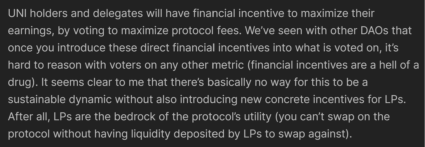The Uniswap Foundation’s (UF) proposal aims to revitalize Uniswap's governance by sharing fee revenue with those who have staked their tokens and delegated the voting rights, addressing issues of apathy and free riding within the protocol's community. Holders of UNI tokens with a long-term investment horizon are likely to be interested in generating yield on their holdings to enhance their overall returns. The proposed framework necessitates that these investors either delegate their voting rights to a more actively involved party or step forward to participate in the governance process themselves. This arrangement has positive supply/demand implications for the token’s price and importantly doesn’t revolve around new issuance/dilution of the asset. Further, concentrating the decision-making among more engaged parties should make for streamlined governance.