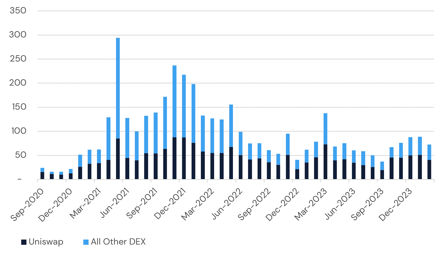 Because it was initiated by the UF, many have heralded the “fee switch” proposal as a unanimous (no pun intended) commitment of Uniswap’s core team. However, the fact that neither Hayden Adams (founder) nor Uniswap Labs (UL) acknowledged the move on social media is notable. The Foundation is a non-profit focused on governance and community, whereas UL, a commercial entity, handles protocol development and innovation. Both groups are U.S.-based where the regulatory emphasis towards tokens has been centered on whether the digital assets represent securities. Recent headlines have featured a handful of important industry wins over the SEC and while we’re still in the early days of discovery, it’s clear that the Bitcoin spot ETFs will have a meaningful impact on the crypto ecosystem and financial markets more broadly. Bringing it all together, given their critical role in overseeing the Uniswap protocol and reputation, it is likely that the UF’s proposal was carried out with consultation across the various stakeholders, prompting Blockworks research analyst Matt Fiebach to comment that “although past attempts at turning on the fee switch have failed, I am confident this time is different, and the proposal is poised to succeed.”
