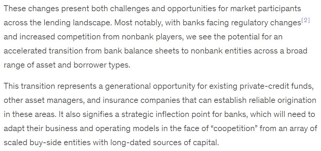 The explosive growth of private credit can be traced back to increased regulation on banks following the Global Financial Crisis. Capital requirements under frameworks like Basel III were designed to de-risk financial institutions by imposing stricter limits on their lending activities and requiring higher reserves. While effective in reducing systemic risk, these regulations inadvertently hampered banks' ability to take on certain types of loans, especially those perceived as riskier or more capital-intensive.