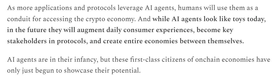 One of the most exciting intersections in technology today is the confluence of blockchain and artificial intelligence. AI agents, increasingly capable of autonomous decision-making and task execution, are finding applications across industries. When integrated with blockchain, these agents gain enhanced security, transparency, and accountability. Perhaps most importantly, they also gain access to the on-chain economy, with its embedded digital asset ownership and value transfer, allowing them to contribute to crypto’s economic output autonomously. What have started out as digital characters that raise funds and deploy the capital on-chain will continue to evolve. They are already optimizing investment strategies and enhancing fraud or exploit detection.